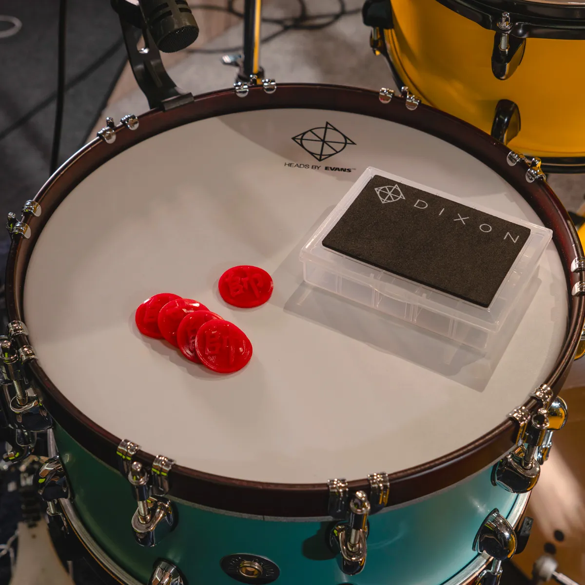 - 5 červené tlumicí polštářky (35 x 3,5 mm), které účinně snižují nežádoucí alikvoty a kontrolují dozvučení bubnů,