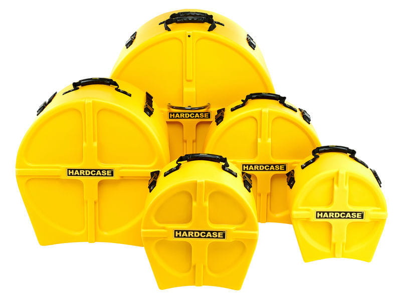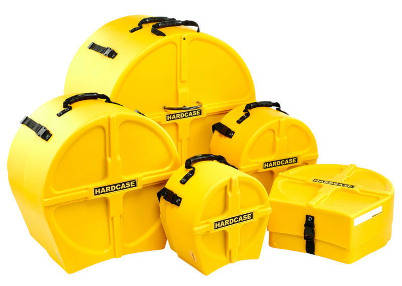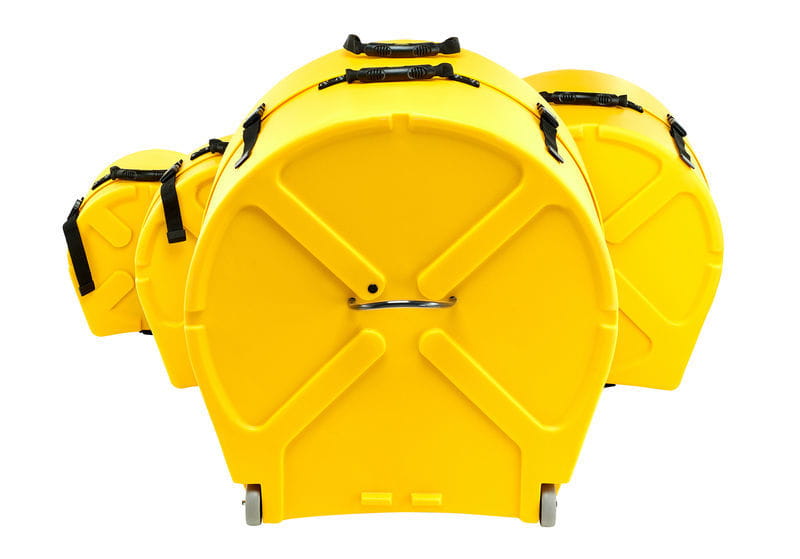 Sada pevných pouzder z lehkého plastu, vybavená zámkovým systémem „quick-lock clips“, přizpůsobená pro přepravu a skladování bubnových tomů. Pouzdro na basový buben má dvě kolečka.