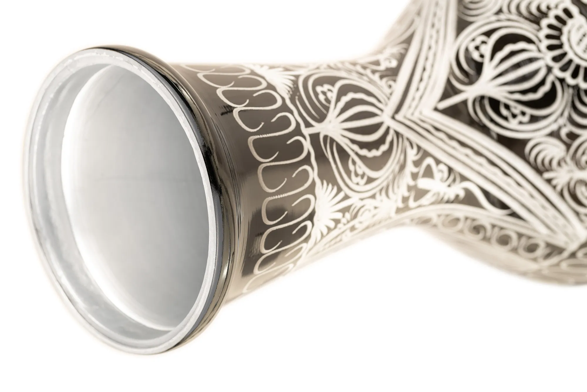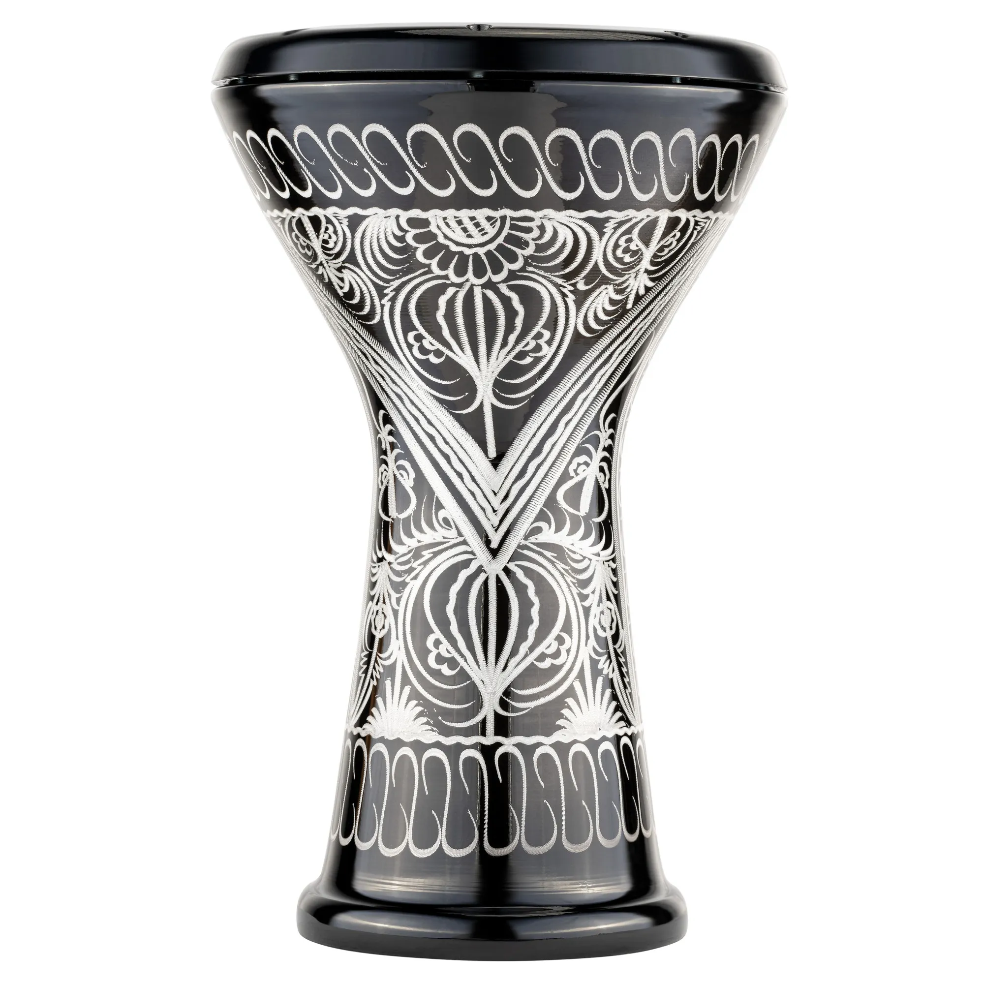 Tento hliníkový doumbek je klasický bicí nástroj s jedinečným, jasným a elastickým zvukem typickým pro hudbu Středního východu. Ručně rytá mísa mu dodává jedinečný vzhled a černá povrchová úprava podtrhuje eleganci nástroje. Díky syntetické membráně je doumbek odolný, odolný vůči klimatickým změnám a připraven ke hře za jakýchkoliv podmínek.